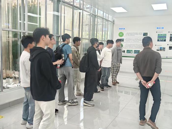 在微藻固碳项目基地,500㎡养藻区与林立的立柱式光生物反应器让人眼前一亮。在国家“双碳”目标的驱动下,技术人员现场讲解了微藻固碳的技术原理,“年减排CO₂≥15吨、年产藻粉≥7.5吨”的核心数据,让师生们直观感受到科技创新在低碳发展中的重要作用。大家近距离观察微藻养殖状态,围绕技术应用、产业前景等问题与技术人员深入交流,对绿色能源产业的发展潜力有了更直观的认识。
