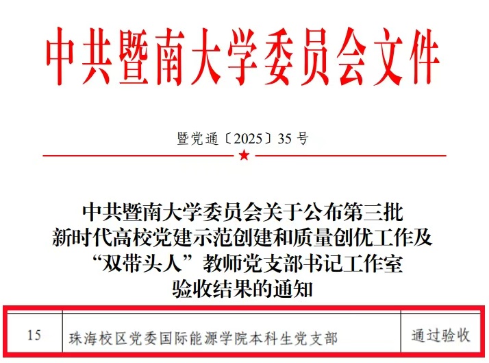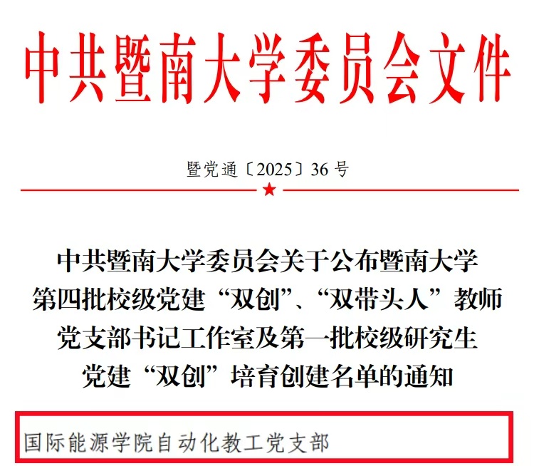 近日,中共暨南大学委员会公布了第三批校级样板党支部验收结果及第四批校级党建“双创”工作培育创建名单。国际能源学院自动化教工党支部凭借扎实建设与突出表现脱颖而出,成功入选第四批校级样板党支部;本科生党支部顺利通过第三批校级样板党支部验收,充分彰显了国际能源学院在基层党组织建设成效。