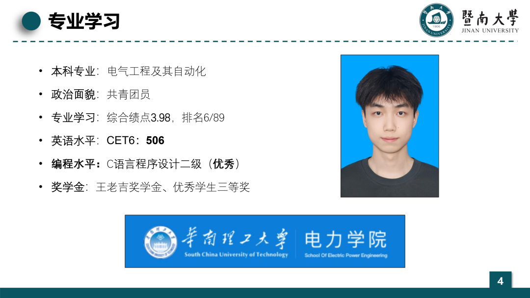 个人简介:谷新研,男,汉族,共青团员,2022级电气工程及其自动化专业本科生。曾获得暨南大学王老吉奖学金,优秀学生三等奖学金,MCM美国大学生数学建模竞赛H奖,全国大学生数学竞赛(非数学A类)二等奖,目前有两篇论文在投。曾担任国际能源学院办公室助理、学业助教,、宿舍层长等职位。