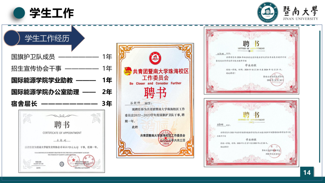 对于学有余力的同学,在课余时间参加学生工作也是非常能够锻炼提升自己的。在担任我们学院办公室助理的两年时间里,我熟练地掌握了大多数办公软件,并且锻炼了优良的沟通能力,对于工作对接以及临场处理问题的能力都有极大的提升。但是也不建议大家花费过多的时间在学生工作上,在大二大三,课内的学业压力还是比较大的,时间也比较紧张,一定要平衡好和课内学习的时间。